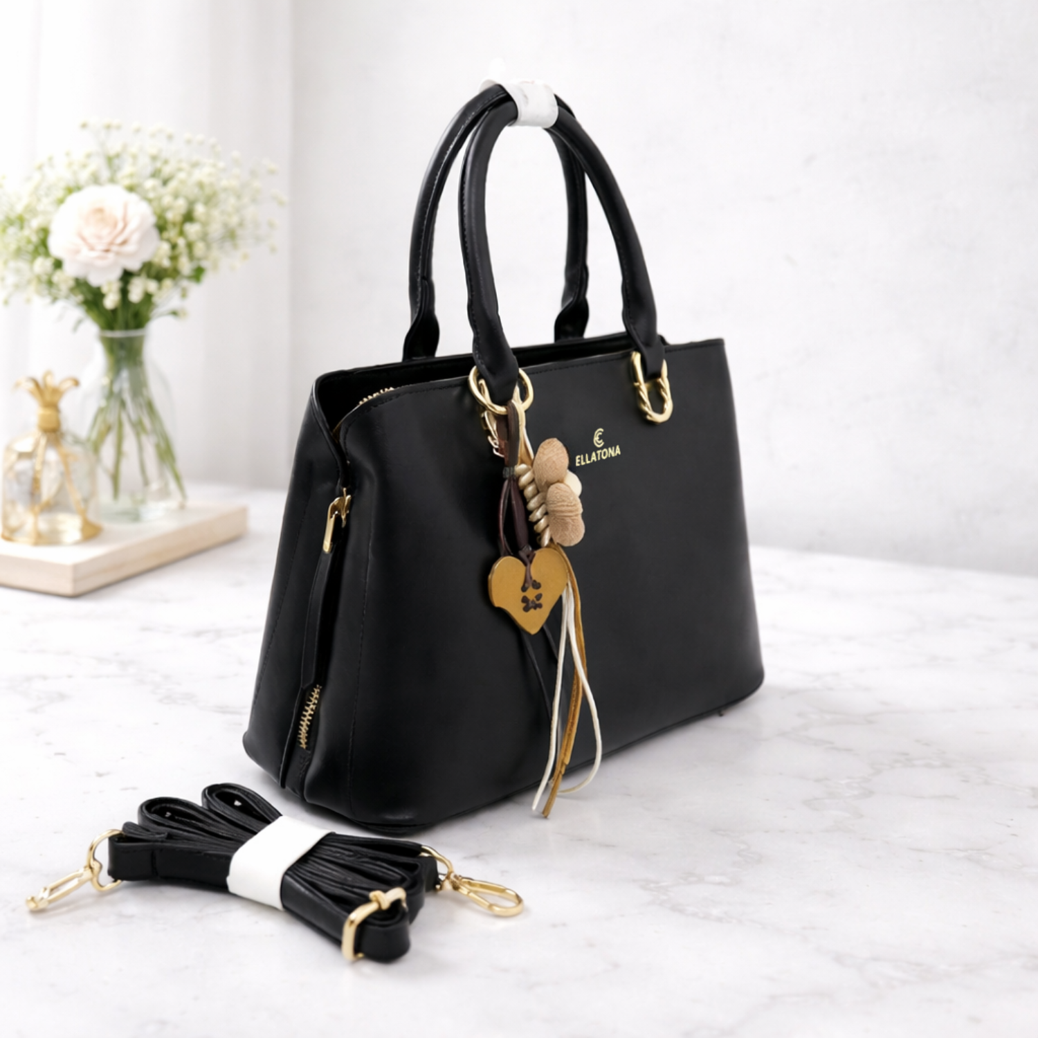 The ELLATONA Women’s Structured Tote Handbag is designed for everyday functionality with a clean and organized layout. Its structured build helps maintain the shape of the bag, keeping your essentials well-arranged and easy to access. The bag features a 3-compartment design, including a center zip compartment for secure storage and two open compartments for quick access. This layout allows you to separate your items efficiently without clutter. It comes with sturdy top handles and a detachable shoulder strap, giving you flexibility to carry it as a handbag or shoulder bag based on your comfort. The front is detailed with a floral charm accent, adding a subtle decorative touch while keeping the overall look simple and elegant. The medium size makes it suitable for carrying daily essentials like your phone, wallet, small notebook, and personal accessories.